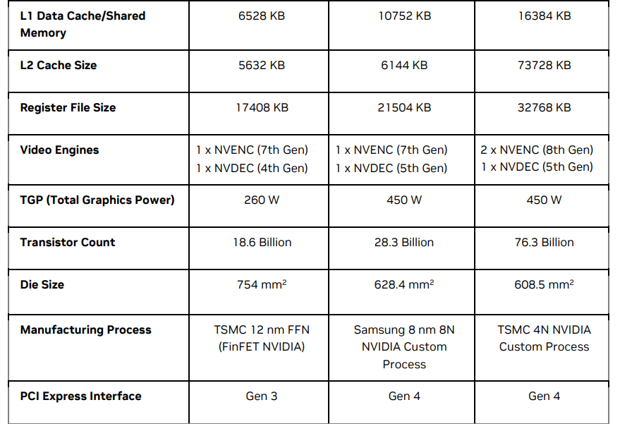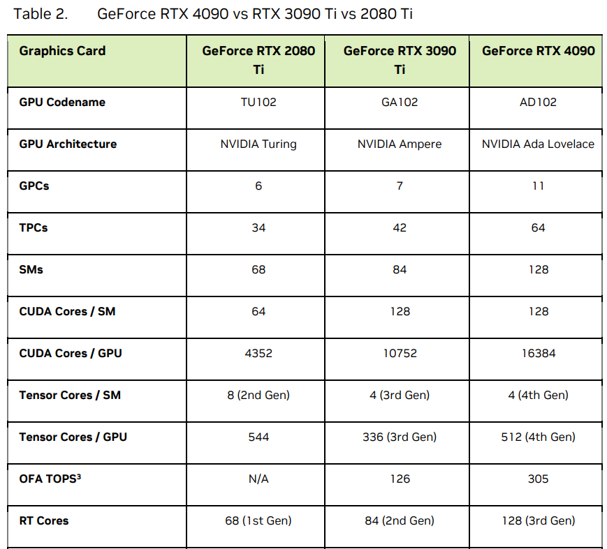 CUDA Core의 수가 꽤 많이 증가했다. 그리고 Tensor Cores의 수와 버전도 올라가고.